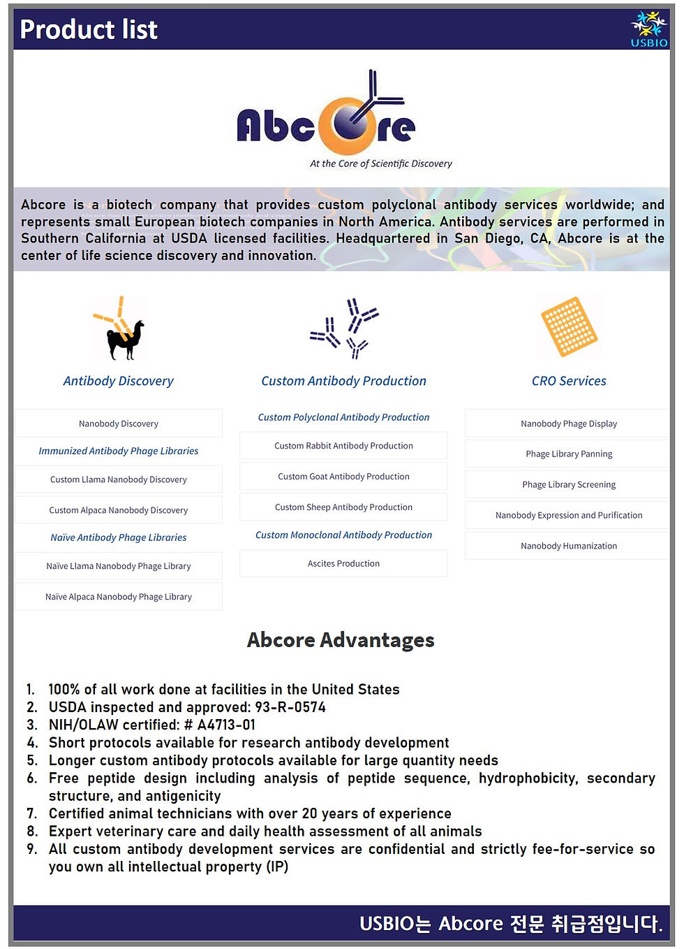 Abcore는 전 세계적으로 맞춤형 다클론항체 서비스를 제공하는 생명공학 회사입니다. 북미 지역의 소규모 유럽 생명 공학 회사를 대표합니다. 항체 서비스는 남부 캘리포니아의 USDA 허가 시설에서 수행됩니다. 캘리포니아 샌디에이고에 본사를 두고 있는 Abcore는 생명 과학 발견 및 혁신의 중심에 있습니다.