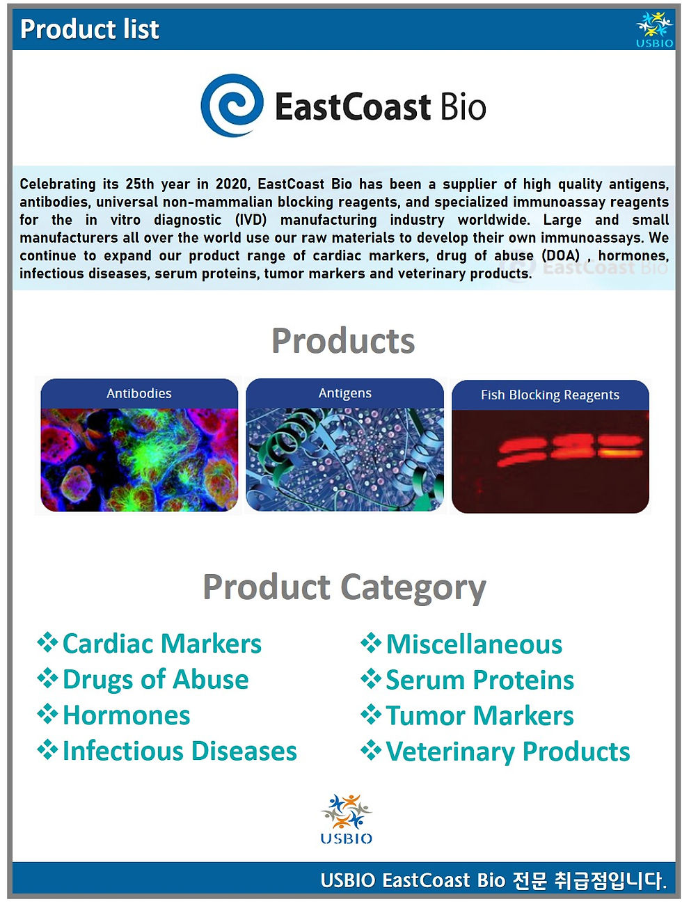 EastCoast Bio는 2020년 창립 25주년을 맞아 전 세계 체외진단(IVD) 제조업계를 위한 고품질 항원, 항체, 보편적 비포유류 차단 시약, 전문 면역측정 시약 등을 공급해 왔습니다. 전 세계의 크고 작은 제조업체들은 자체 면역측정법을 개발하기 위해 EastCoast Bio의 원료를 사용합니다. EastCoast Bio는 심장 마커, 약물 남용(DOA), 호르몬, 전염병, 혈청 단백질, 종양 마커 및 수의학 제품의 제품 범위를 계속 확대하고 있습니다.