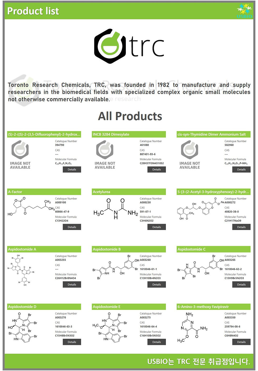 Toronto Research Chemicals, TRC(토론토 리서치 케미칼스)는 상업적으로 이용 가능하지 않은 특수 복합 유기 소분자를 제조 및 공급하는 회사이며 Toronto Research Chemicals, TRC는 350,000 개가 넘는 광범위한 카탈로그를 제공하고 있습니다.