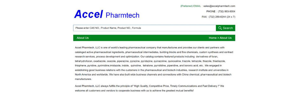 Accel Pharmtech는 당사의 고객 및 파트너에게 카탈로그화된 활성 의약품 성분, 의약품 중간체, 구성 블록 및 미세 화학 물질, 맞춤형 합성 및 계약 연구 서비스, 프로세스 개발 및 최적화를 제조 및 제공하는 세계 최고의 제약 회사 중 하나입니다. 당사의 카탈로그에는 퓨란, 테트라히드로프랑, 옥사디아졸, 옥사졸, 피페라진, 피리다진, 키나졸린, 키녹살린, 트리아졸, 테트라졸, 티아졸, 티아졸, 티오펜, 피리딘, 이미다졸, 인드리놀린, 테트라졸, 테트라졸 유도체를 포함한 주요 제품들이 포함되어 있습니다.