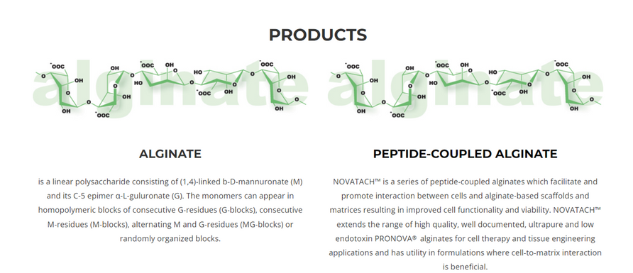 NovaMatrix는 제약, 생명 공학 및 생물 의학 산업에서 사용하기 위해 잘 특성화되고 문서화 된 초순수, 생체 적합성 및 생체 흡수성 생체 고분자를 생산 및 공급합니다. 약물 전달, 조직 공학, 세포 캡슐화 및 의료 기기와 같은 응용 프로그램이 포함되면서도 여기에 국한되지는 않습니다. 초순수 알긴산 나트륨과 히알루론산 나트륨의 경우 미국 FDA의 Drug Master Files를 유지 관리합니다.